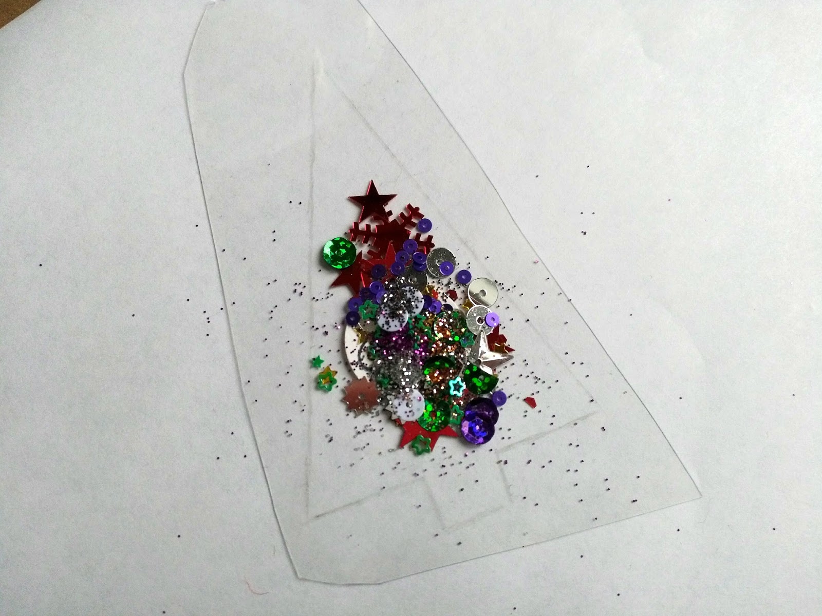 Начинаем наполнять нашу елочку. Чтобы был хорошо виден контур, под пленку подложила белый лист. Кладем нашу фишку и насыпаем внутрь контура различные пайетки, сухой глиттер, звездочки. Аккуратно накрываем вторым кусочком пленки и переходим к швейной машинке.